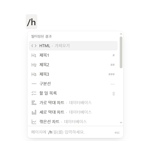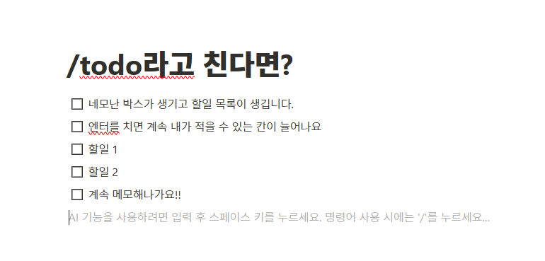 🅰️ 아니지만, 쓰면 훨씬 편해요. /todo, /heading, /table 같은 명령어로 원하는 블록을 빠르게 넣을 수 있어요.