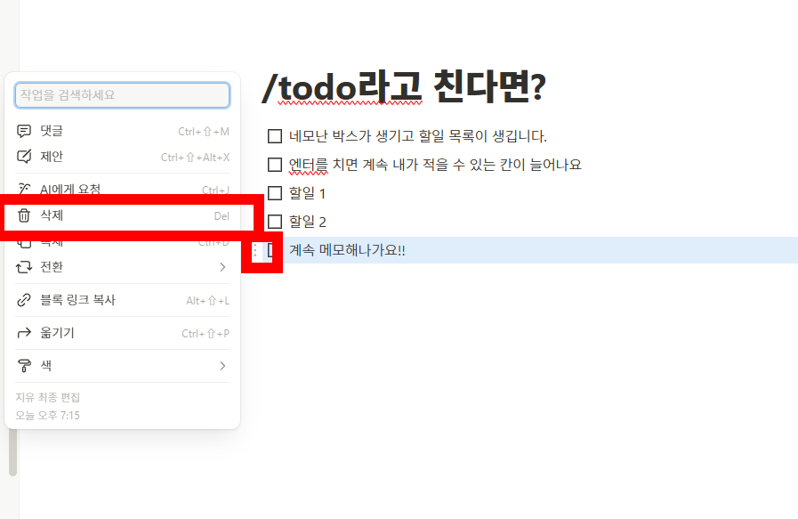 - 본문에 /todo 입력 후 체크리스트 만들기
